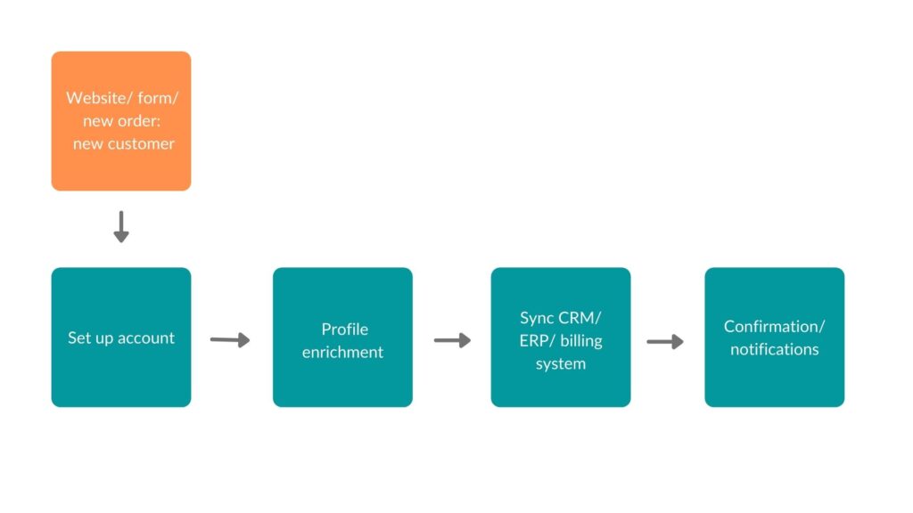 As a next step in your workflow, you can use the customer data to set up an account. Optionally, you could also enrich the customer profile with information from internal and external sources, and check data for accuracy and completeness.