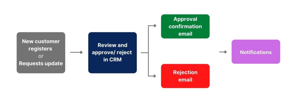 - Customer receives a confirmation or rejection email with relevant info/ next steps