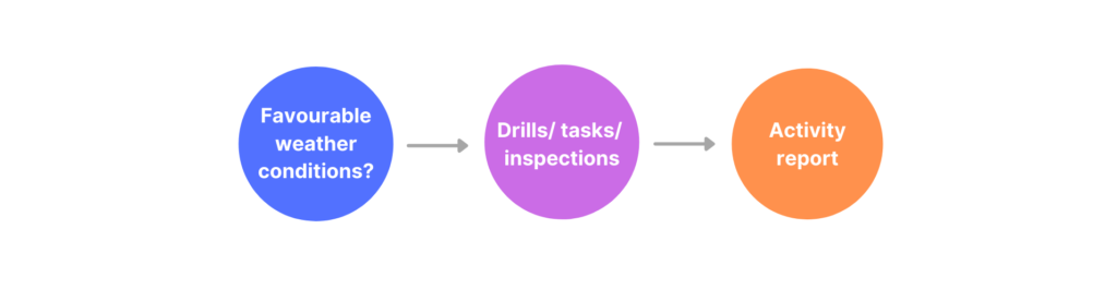 For instance you can set up a workflow that receives data from a weather app or source, and uses custom parameters to specify if/ how machinery can perform, or if a ground task can proceed.